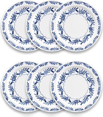An azul flower pattern brings an elegant finish to a dinner plates made from durable, dishwasher-safe melamine.