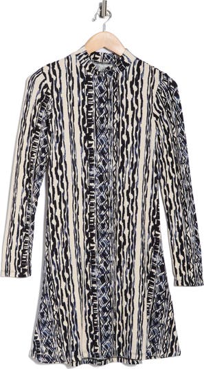 A geometric pattern emboldens this fit-and-flare dress framed by a mock neck and long sleeves.