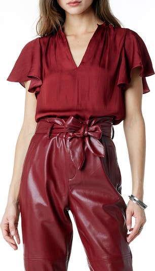 Ruffled sleeves add movement and flow to this satin top that adds instant charm to your in-office or off-duty looks.
