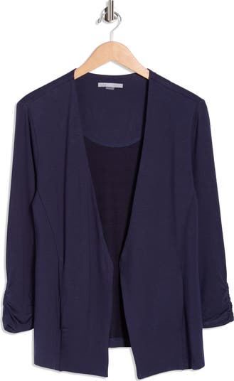 A draped, open-front and collarless design deliver a contemporary polish to a blazer updated with scrunched sleeves.