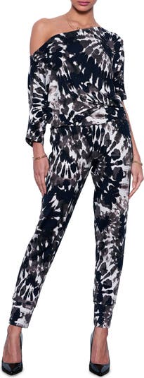 A simple tie belt at the waist gives shape to this stretchy jumpsuit styled with a skinny leg.