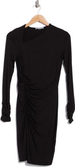 Upgrade your LBD collection with this asymmetric-neck midi cut in a figure-skimming silhouette with side ruching and a softly flared skirt.