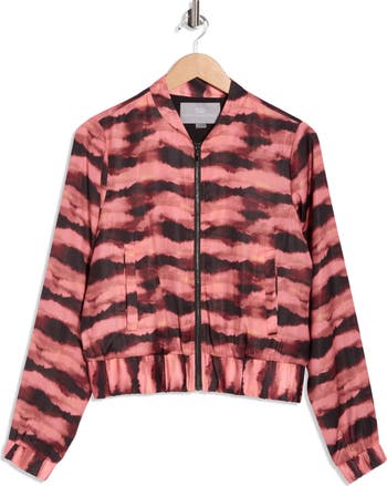 A tie-dye inspired print delights a lightweight and luxurious satin bomber jacket finished with a glossy exposed zipper.