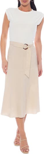 Feel your finest in an elegant midi dress framed with cap sleeves and a resin-buckle sash belt.
