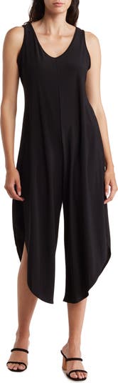 A sleeveless jumpsuit features wide legs in a cropped silhouette for effortless style. - V-neck - Sleeveless - Pull-on style - Wide leg - Solid color - Knit construction - Cropped - Approx. 31" rise, 22" inseam (size S) - Made in USA of imported materials