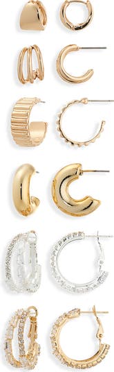 Add a festive shine to your style with this set of huggie hoop earrings featured in an assortment of textures, finishes and shining crystals.