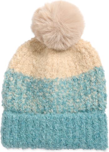A playful faux-fur pom sits atop this colorblocked beanie made of a textural bouclé knit.