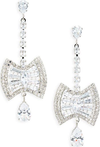 Mixed-cut crystals illuminate glamorous drop earrings suspending sparkling bows and swingy teardrops.