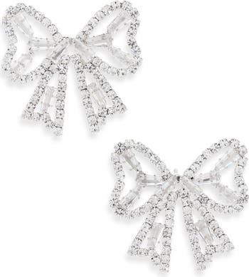 Baguette-cut and round crystals illuminate these open-bow stud earrings that bring glamorous sparkle to your night-out looks.
