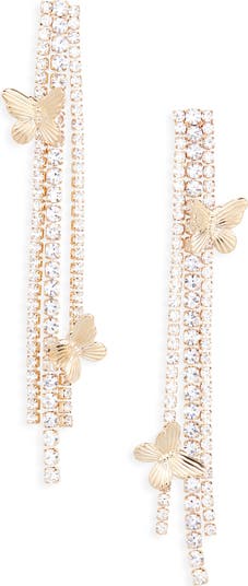 Sparkling crystals illuminate these stunning linear drop earrings accented by textured butterflies for whimsical shine.