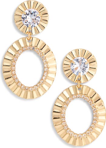 Sparkly crystals illuminate these artfully textured earrings suspending open-oval drops to catch the light.