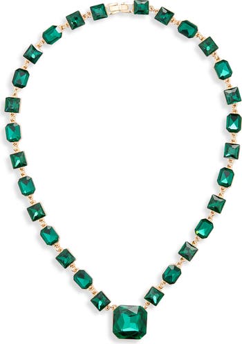 Mixed-cut green crystals illuminate this striking collar necklace that brings instant glamour to your evening.