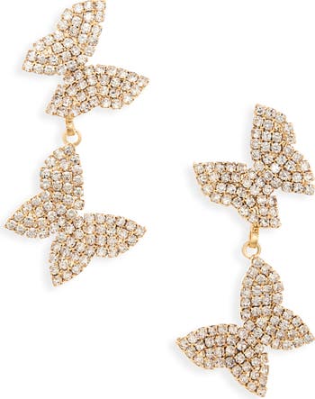A pair of double-drop earrings sparkling with crystal pavé creates the illusion of butterflies floating from your lobes.