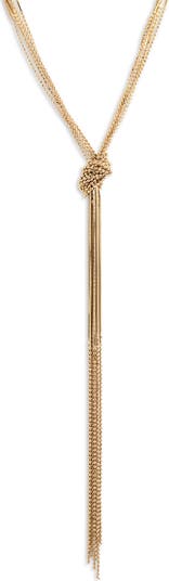 Perfect to layer or wear solo, this knotted Y-necklace is composed of layered cocoon and ball chains for striking shine.