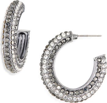 Pavé rainbow crystals bedazzle glamorous hoop earrings finished in gleaming goldtone plate.