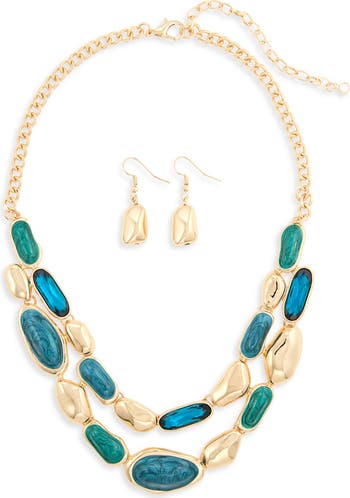 Show off fluid shine with this layered necklace and earrings set featuring pebble-shaped links accented by swirly enamel and sparkly cubic zirconia.