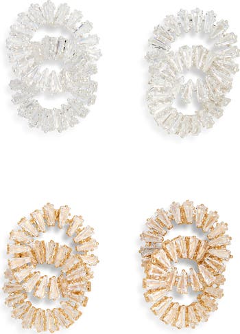 Show off glamorous sparkle with this set of interlocking circle stud earrings illuminated by baguette-cut crystals.