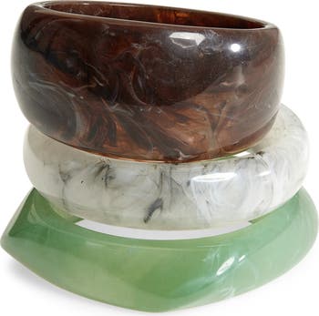 A trio of bangle bracelets crafted from glossy resin in a collection of colors is a perfect way to refresh your jewelry collection.