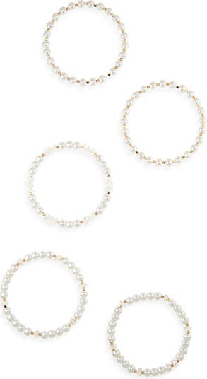 Set of 5 Faux Pearl & Crystal Beaded Stretch Bracelets