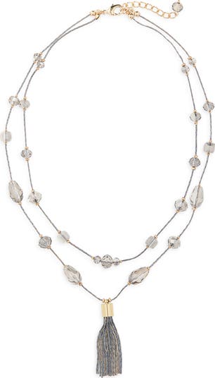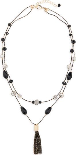 Show off boho-chic style with this layered station necklace illuminated by faceted crystal beads and centered by a swingy tassel pendant.