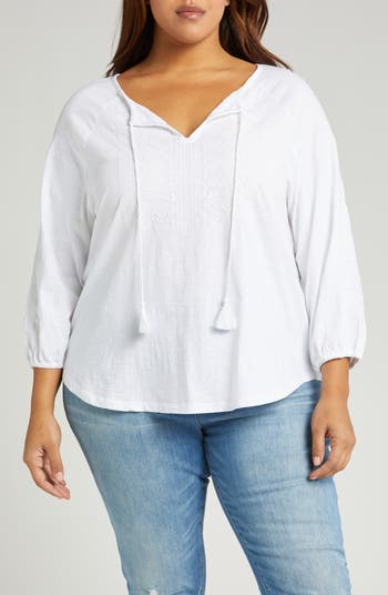 All-cotton fabrication keeps you comfortable in a stylish split-neck top framed by three-quarter sleeves.