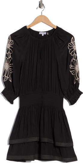 Floral embroidery charms the sleeves of this boho minidress shaped by smocking at the waist.