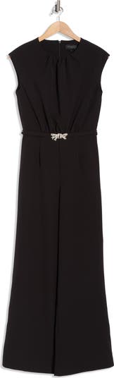 A crystal-embellished bow takes center stage on this belted jumpsuit designed with dramatic wide legs.