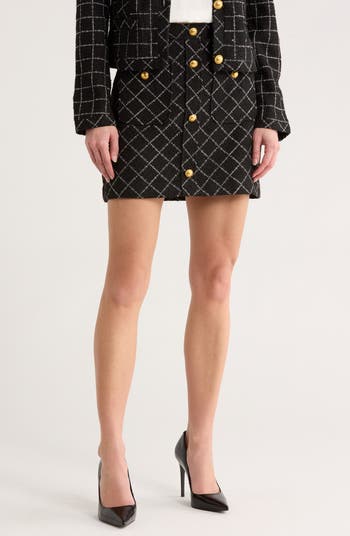 Decorative buttons enhance the polished style of this high-waisted miniskirt cut from windowpane-textured tweed.