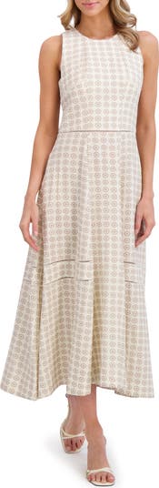 Ladder-stitch details add pretty polish to a summery linen dress patterned in subtle shades and perfected with a pair of pockets.