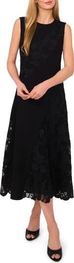 An asymmetric panel of floral guipure lace winds around the A-line silhouette of this polished midi dress that makes an elegant choice for warm-weather special occasions.