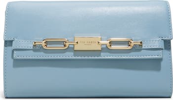 Dedicated storage for card, cash and coin keep your valuable organized in this posh clutch-wallet trimmed with glossy hardware for a little bit of shine.