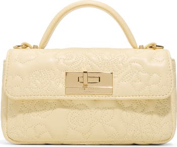 Rosette stitching delivers coquettish charm to a faux-leather bag that can be carried by the top handles or crossbody strap for versatile appeal.