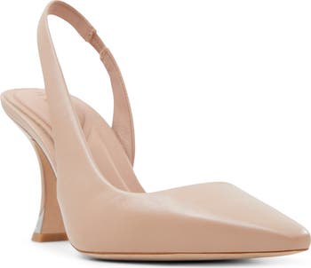 A slingback strap and logo-embellished heel provide sophisticated finishing touches for this classic pointy-toe pump.