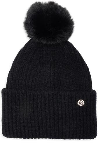 A fluffy faux-fur pompom sits perfectly atop a ribbed-knit beanie fashioned with a wide, cuffed brim for signature cold-weather style.