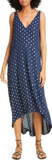 Effortlessly chic, a loose-fitting crepe dress is spotted with silvery shine and cut with a high/low hem that moves with a pretty flutter.