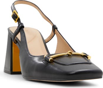 Polished bit hardware and a square toe add distinguished touches to a slingback pump lifted by a flared block heel.