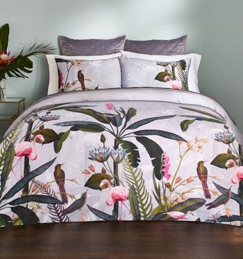 Known for fine-art prints of flora and fauna, Ted Baker London brings its idyllic romance to a pale grey duvet set of cotton sateen.