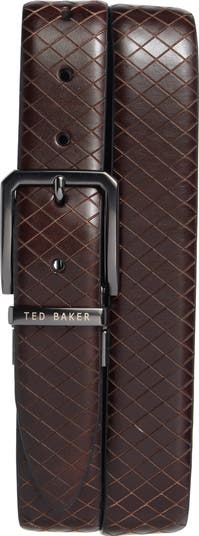 An onyx-hued buckle fastens this embossed leather belt that reverses for easy versatility.