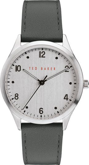 A retro-inspired watch with a clean, minimalist display comes with a brushed round case and a topstitched leather strap that has a lively reverse print.
