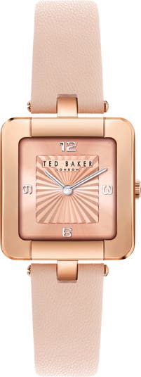 This minimalist leather strap watch features a square case and four numeral indexes.