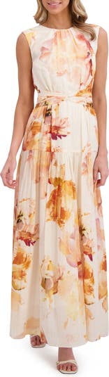 Dreamy blooms unfurl across the softly pleated silhouette of a party-perfect maxi dress mostly made from cool cotton.