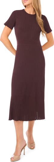 Dainty stitchwork and a scalloped hem sweeten a desk-to-dinner dress shaped with a set-in waist.