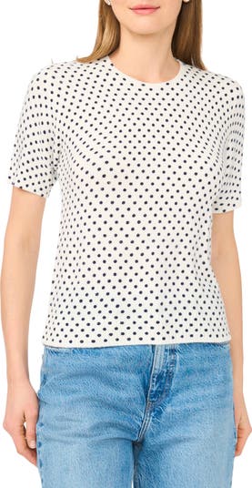 A fitted, short-sleeve silhouette lends versatility to this sweater knit with a polka dot motif.