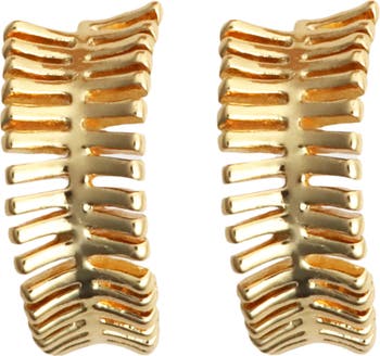 Dimensional bars catch the light on bold hoop earrings plated in warm 14-karat gold for added shine.