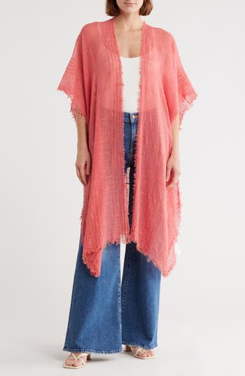 Metallic threads shimmer throughout a lightweight woven duster with fringed borders for a relaxed finish.