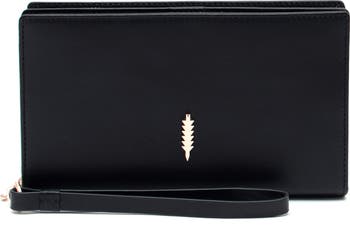 Keep cards and cash conveniently on-hand with this leather wristlet wallet that's compact, organized and detailed with logo hardware.