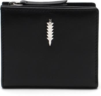 A secure snap button closure ensures your cards are safely stashed in this slim card wallet outfitted with divided compartments for coin and cash. Durable leather with a gleaming feather logo stud finish this enduring style.