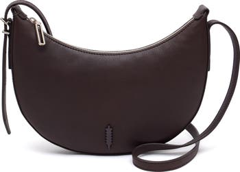 Water-resistant calfskin leather brings all-weather versatility to this crescent-shaped crossbody centered with minimalist hardware.
