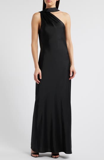 This glossy satin gown enchants from every angle with a pleated one-shoulder neckline and trailing scarf tie that subtly sways with your every step, enhancing the quiet drama of this statuesque dress.