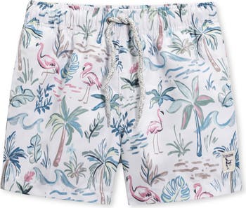 An allover flamingo print adds to the fun of these kid-size swim trunks that are quick drying and water repellent.